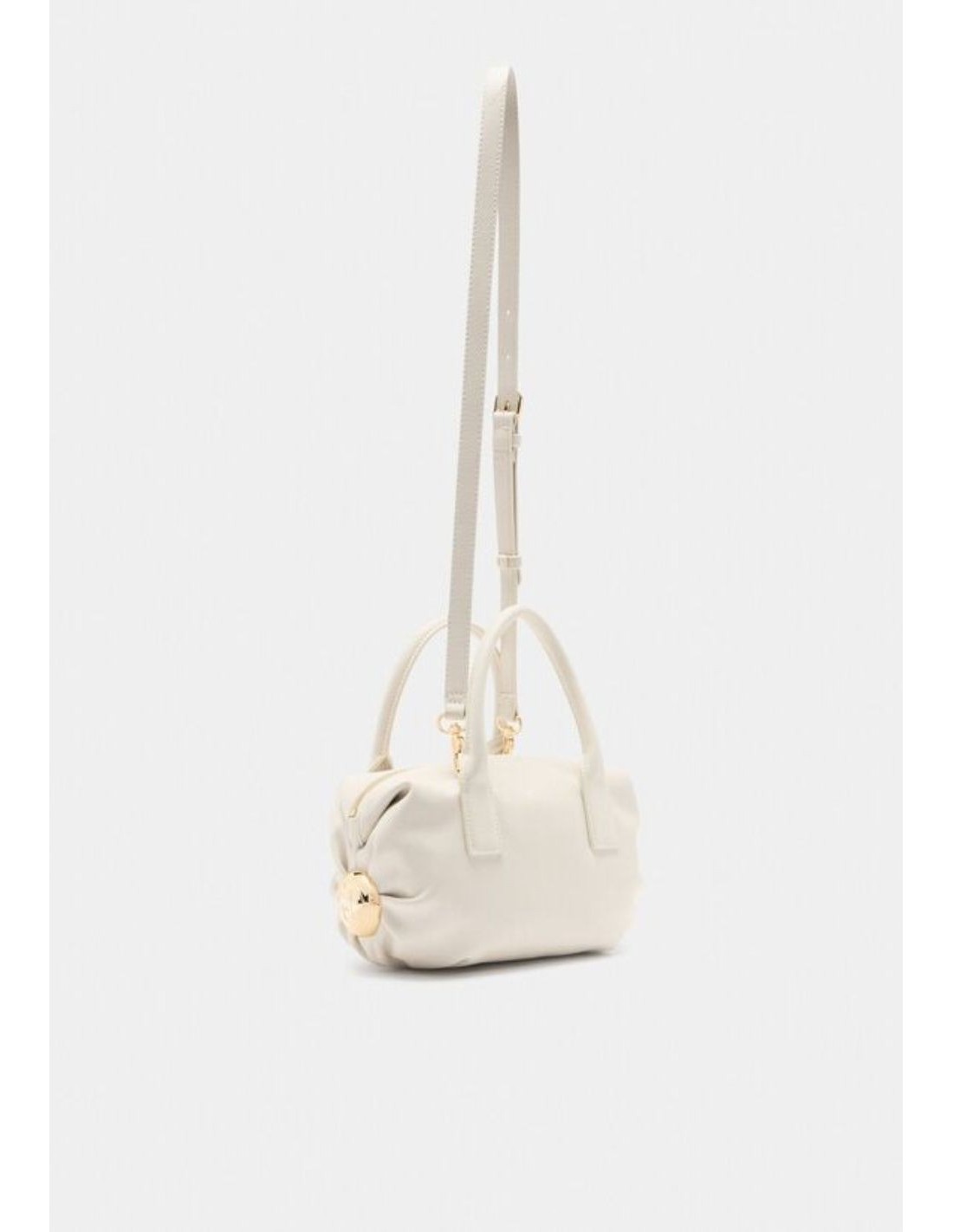 Mini borsa a mano effetto bottalato con charm dorato, tracolla removibile e fodera logata. Eleganza compatta e versatile.