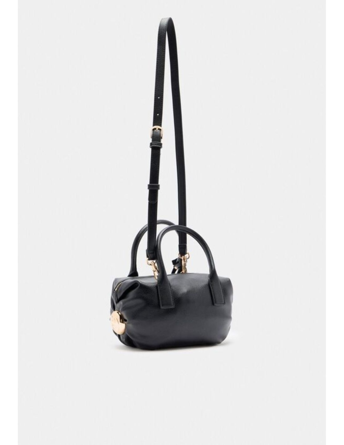 Mini borsa a mano effetto bottalato con charm dorato, tracolla removibile e fodera logata. Eleganza compatta e versatile.