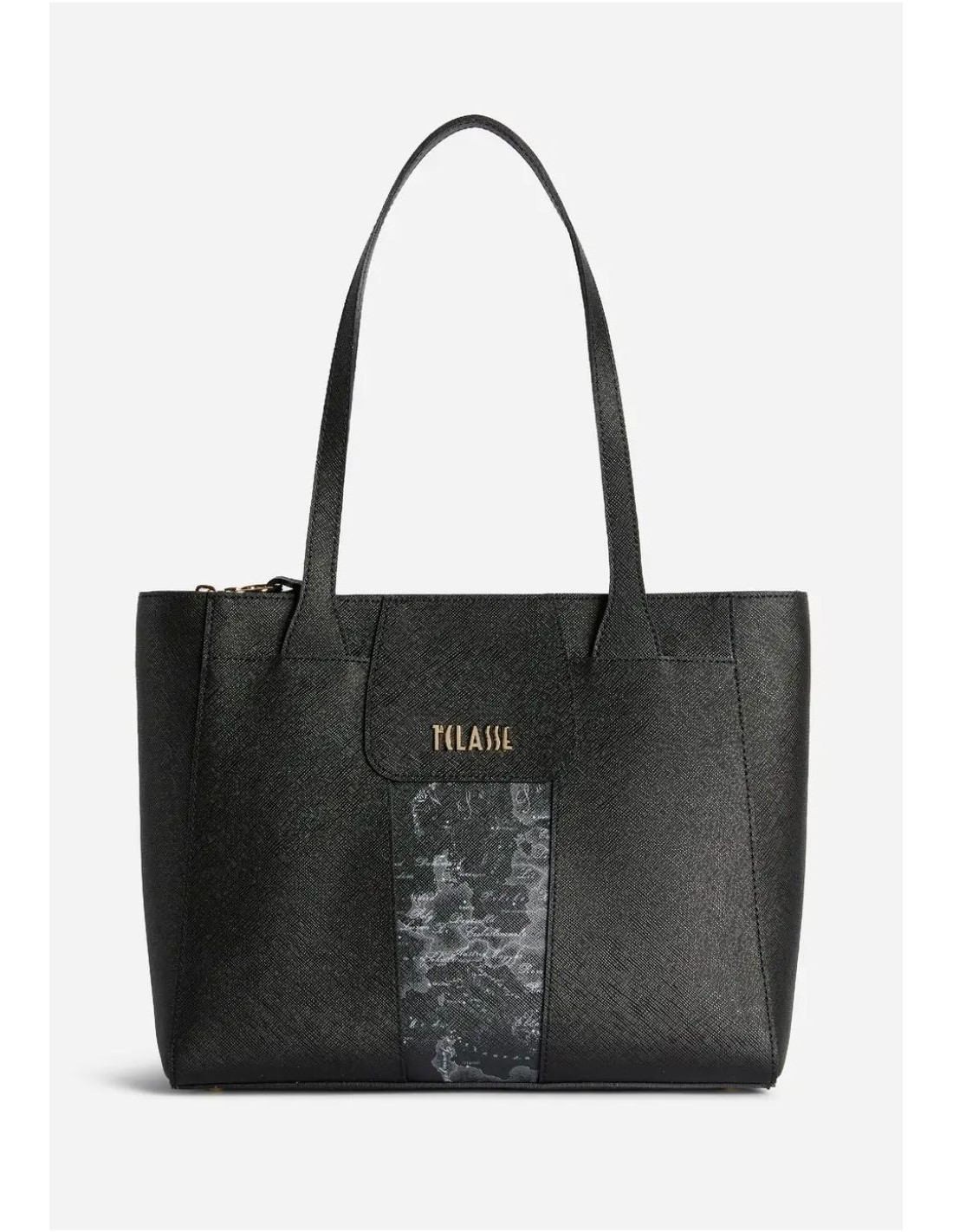 Borsa shopping media in tessuto saffiano nero con inserto Geo Night. Elegante, capiente e organizzata con tre tasche interne.