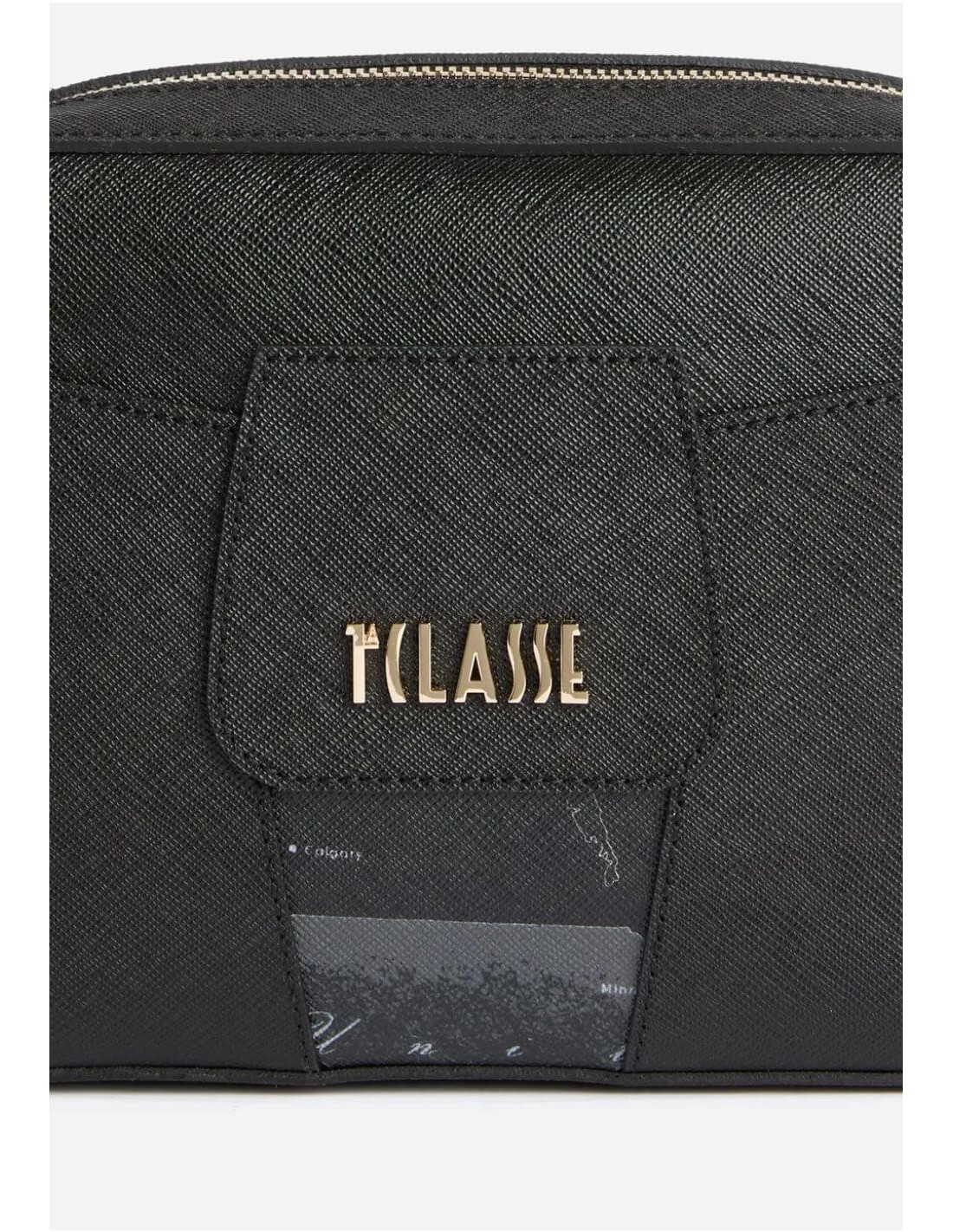 Tracollina reporter compatta in tessuto saffiano nero e Geo Night, con maxi logo 1ª Classe e tracolla regolabile. Stile urban e praticità quotidiana.