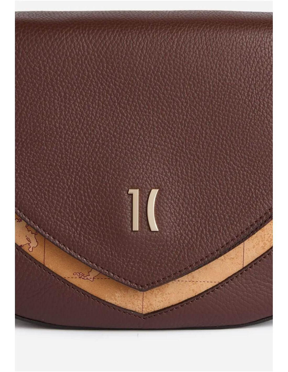 Tracolla in pelle granata con inserto Geo Classic, logo 1C dorato e dettagli raffinati: eleganza moderna e capienza quotidiana.