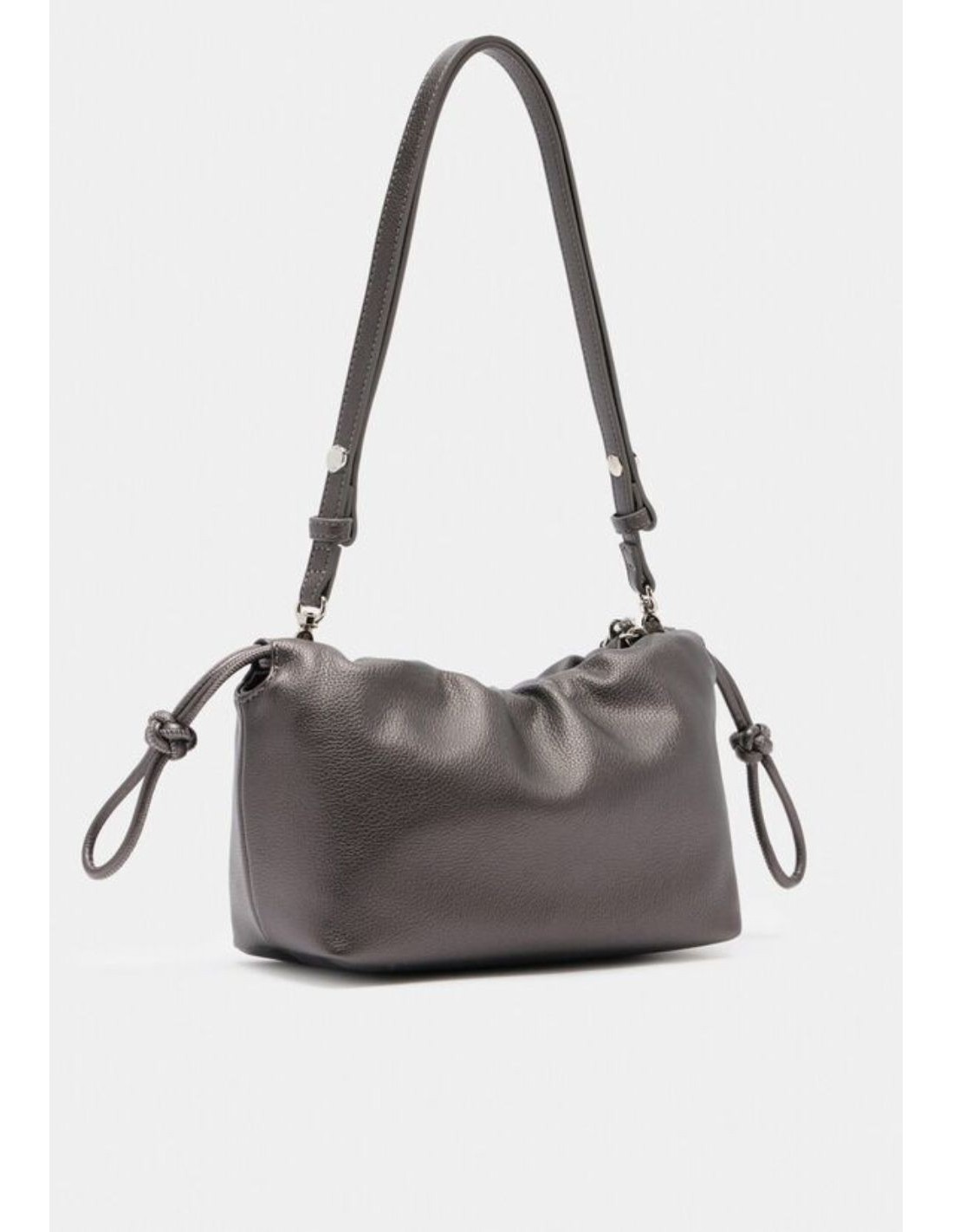 Il logo in metallo frontale aggiunge una nota luminosa, mentre il manico con catena intrecciata offre un tocco glamour ideale per completare look da giorno o da sera. La tracolla rimovibile consente di indossarla anche crossbody o a mano, adattandosi con facilità a ogni occasione.