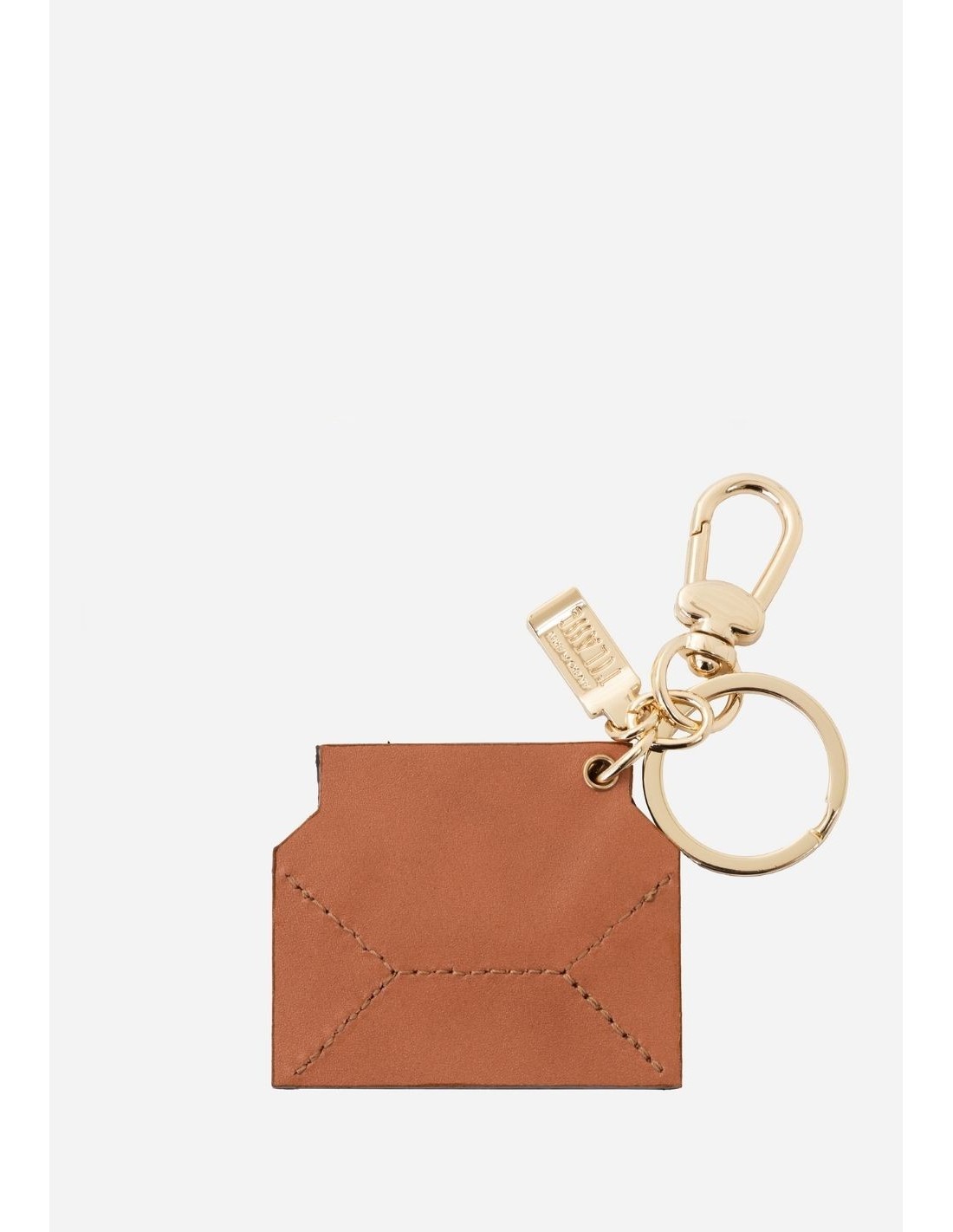 Portachiavi Geo Classic a forma di biglietto di auguri in tessuto iconico e pelle color Cuoio, ideale come raffinata idea regalo.