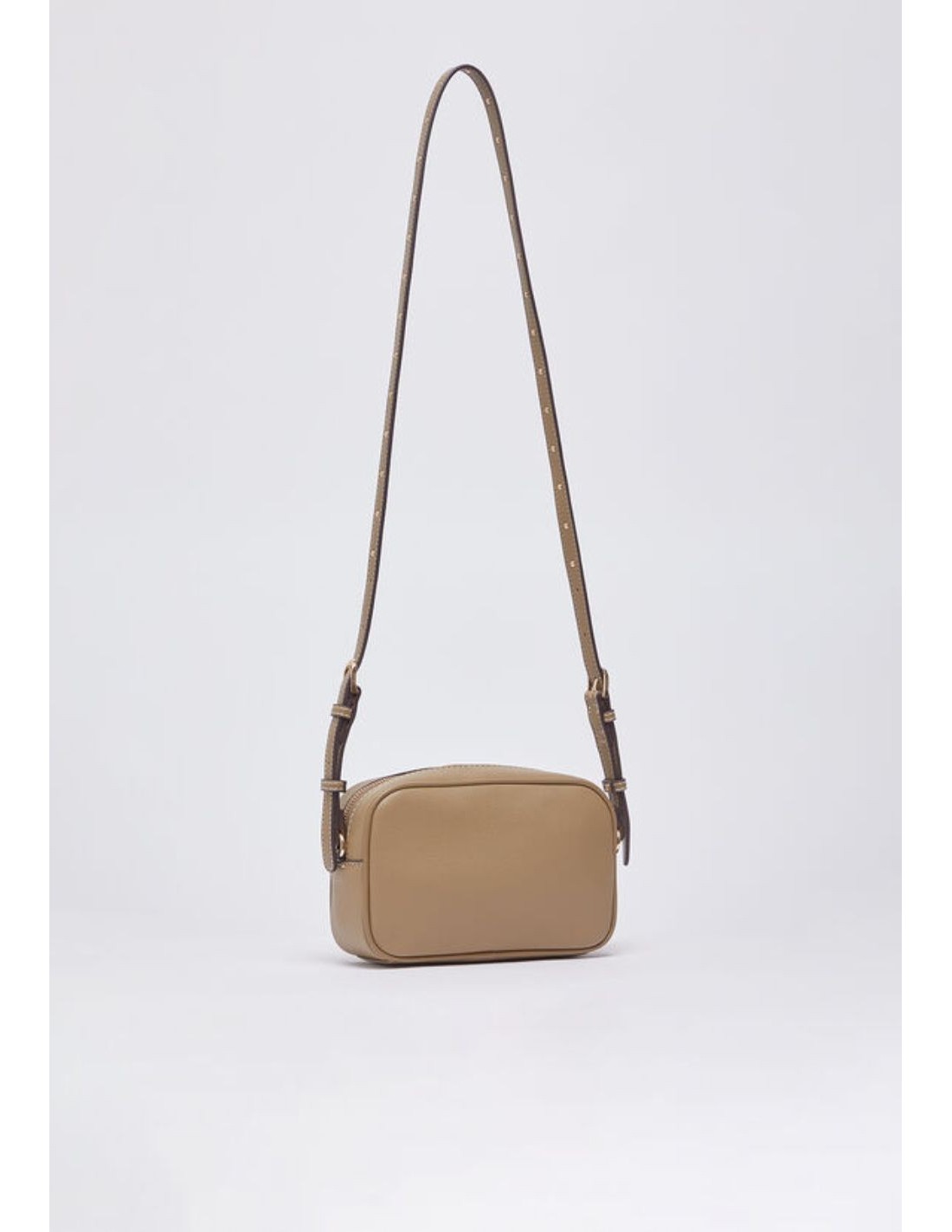 Un mix di carattere e femminilità: la tracolla con borchie incontra la texture bottalata in un formato compatto e super attuale.
