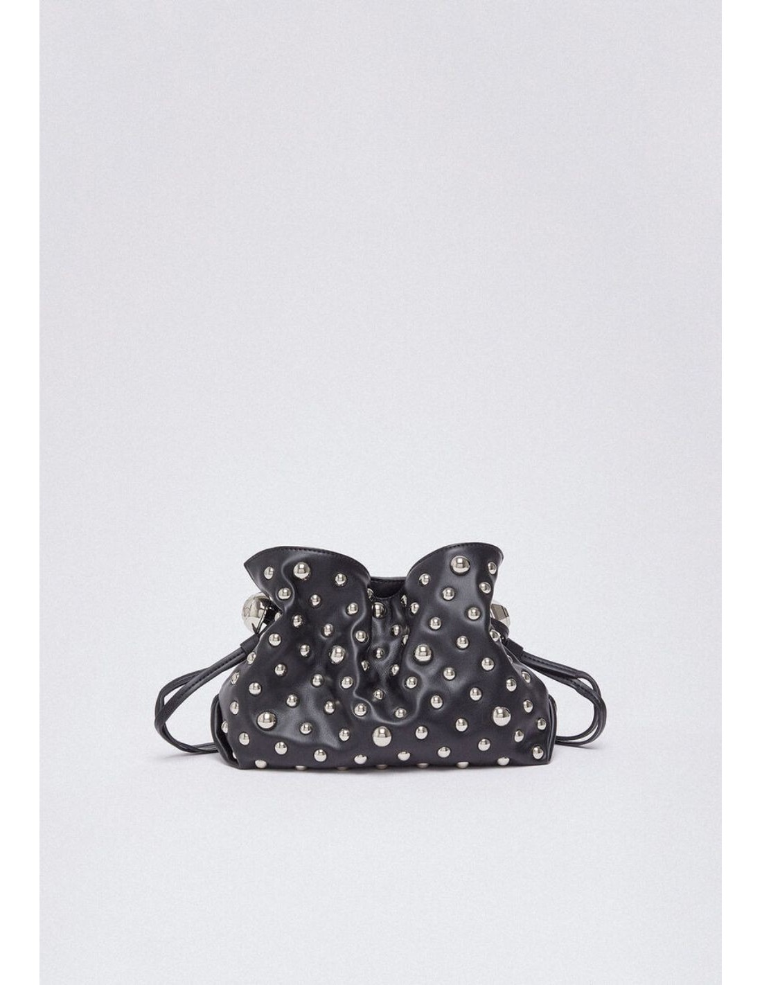 Riccy Bag piccola con borchie all-over e chiusura a coulisse. Morbida, luminosa e dall’anima audace.