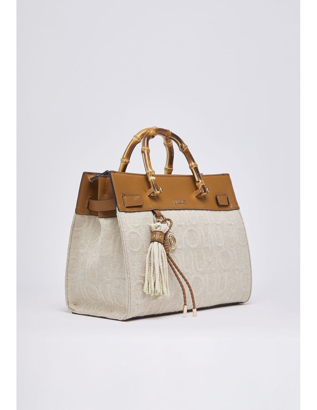Borsa a mano media con inserto in juta e logo in rilievo, manici effetto bamboo, charms e tracolla abbinata. Capiente e raffinata.