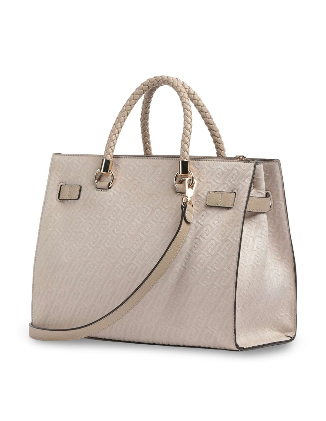 Il design è valorizzato dal logo lettering in metallo e dal charm removibile frontale, dettagli luminosi che aggiungono carattere e personalità. I doppi manici intrecciati in ecopelle offrono una presa comoda e sofisticata, mentre la tracolla regolabile e removibile consente una portabilità versatile, a mano o crossbody.